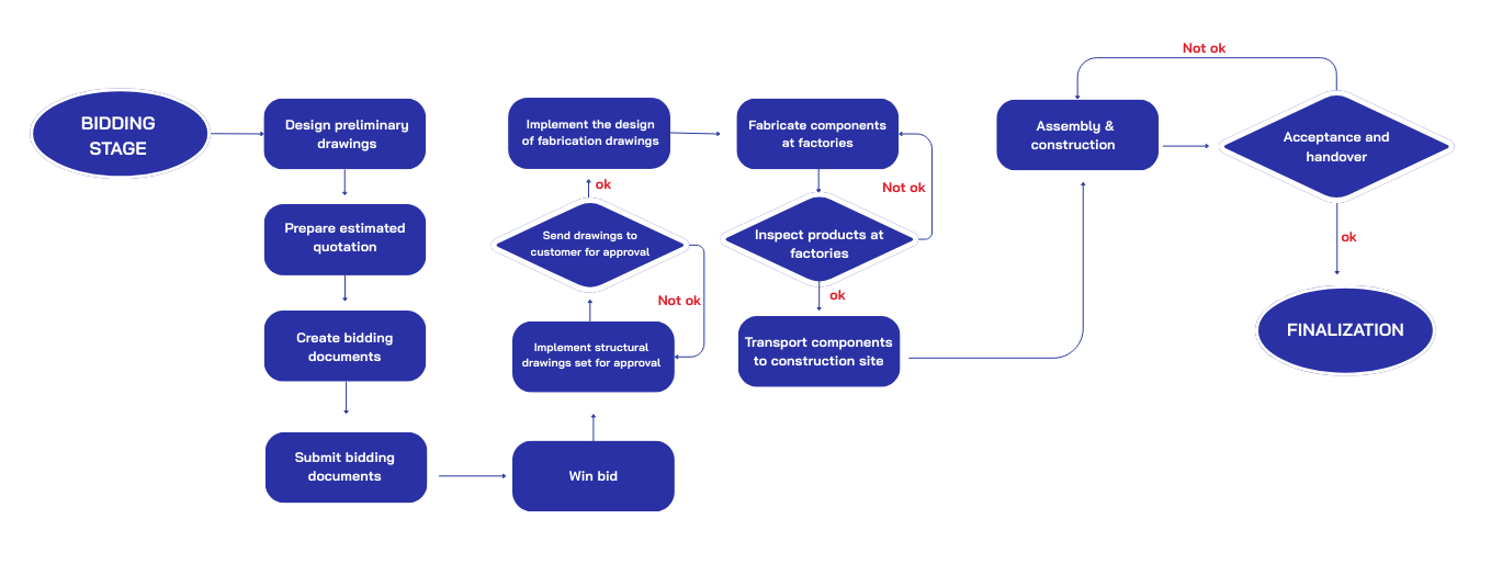 With a deep understanding of various types of construction - from factories, plants to infrastructure projects - CPT STEEL always proposes optimal design solutions, closely following the actual needs of customers. We are committed to providing designs that fully meet technical, aesthetic and functional requirements. To realize that commitment, CPT STEEL's consultation team always provides close companionship, ready to answer all technical questions throughout the process. All the above contribute towards the ultimate goal: to hand customers a sustainable structural steel solution with absolute safety and maximum economic efficiency for the project.