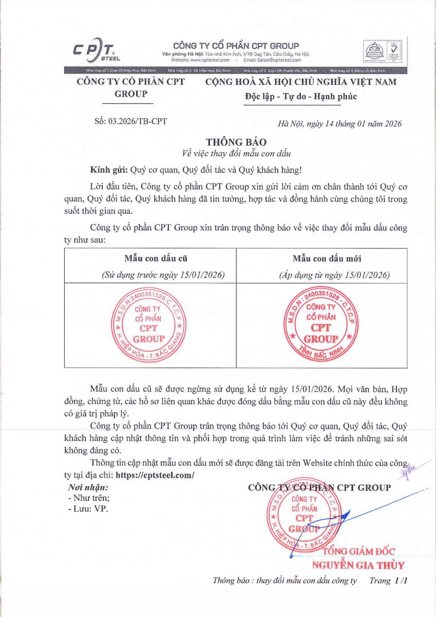 Mẫu con dấu mới có hiệu lực kể từ ngày ký thông báo. Kể từ thời điểm này, mẫu con dấu cũ sẽ không còn giá trị sử dụng trong các văn bản, hồ sơ và giao dịch của Công ty.